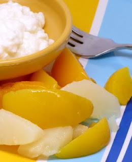 I personally like Breakstones Low Fat Cottage Cheese, although it does contain Modified Food Starch. I was a little unsure if that was good or bad, and while this article is not totally conclusive, it tells you what it is. I may seek out a different brand in the future if I learn it is unhealthy. As far as the fruit goes, you can't really go wrong there! I prefer peaches, mandarin oranges or pineapple in mine, but your personal favorite would probably work just fine. You can cut these up fresh or buy them already cut or canned or jarred. As I've cautioned before, however, read the label. I prefer fruit in water or 100% fruit juice. I tend to stay away from the heavy or even light syrups.